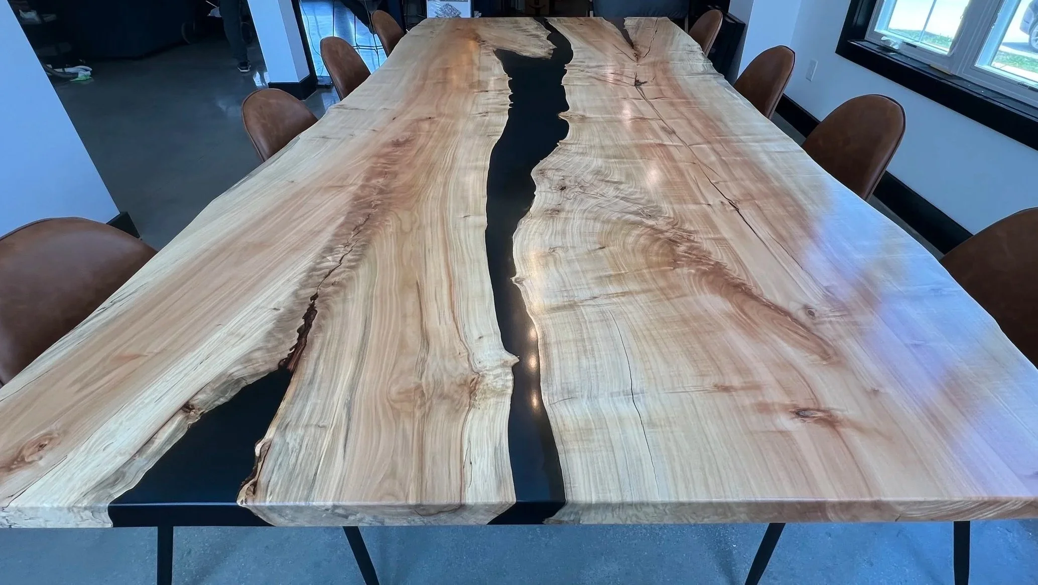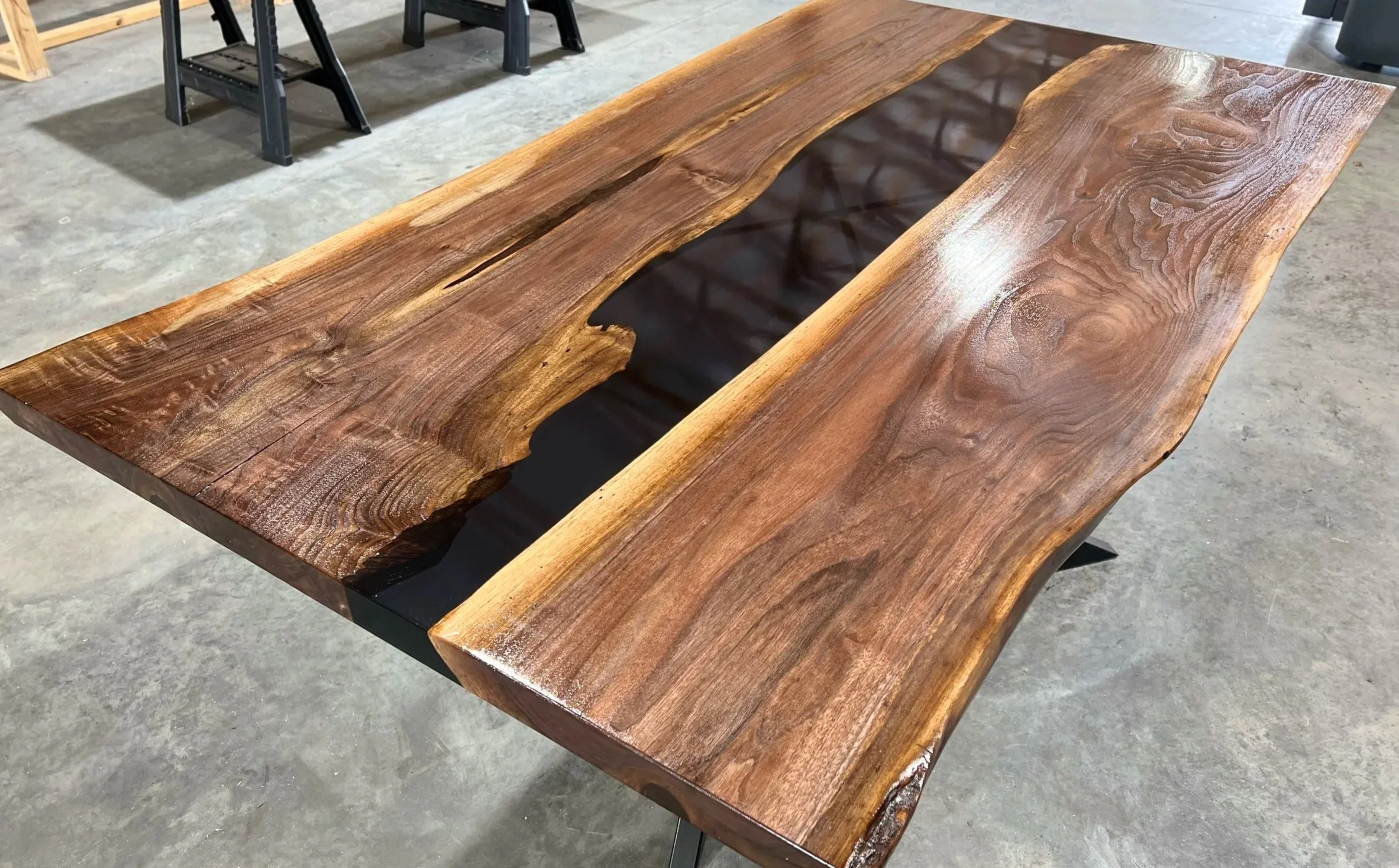 A river-style table design where epoxy is used selectively to stabilize and highlight natural voids in the wood.